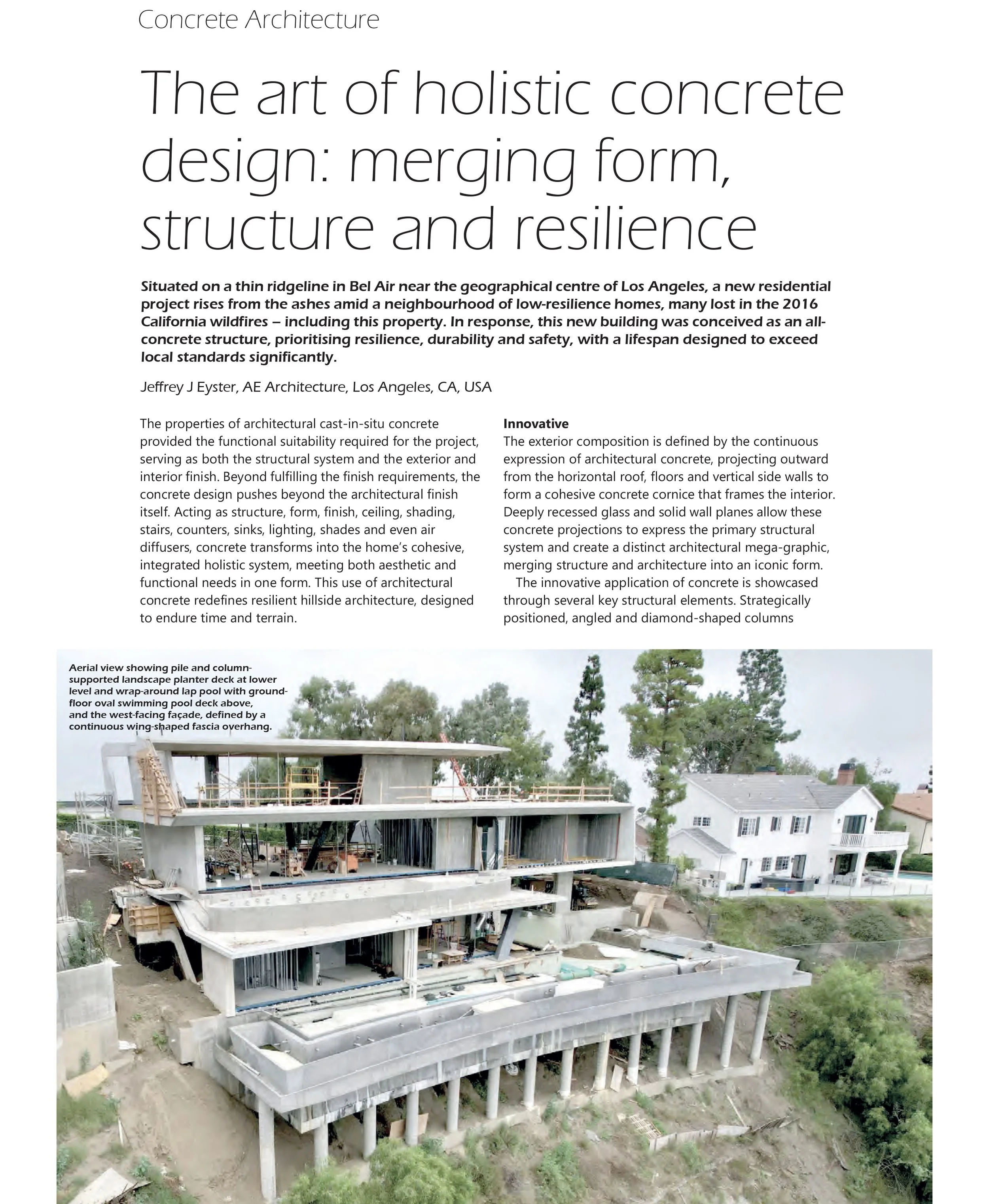 Los Angeles, CA — January 2024 — Architect Jeffrey J. Eyster, AIA, founder of Atelier Eyster Architecture, has been published in the January 2025 issue of Concrete Engineering International with a feature article titled “The Art of Holistic Concrete Design: Merging Form, Structure, and Resilience.” CEI January 2025 pp 26-28 for J…